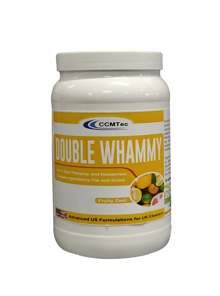 Double Whammy™ ( pH 9-10 ) to niezwykle skuteczny presprey enzymatyczny połączony ze środkiem dezodoryzujący. Dzięki specjalnie opracowane formule, usuwa nawet najtrudniejsze plamy białkowe. Usuwa plamy z krwi. Prespray z łatwością poradzi sobie z zabrudzeniami każdego rodzaju, np. plamami spożywczymi, tłuszczowymi oraz innymi trudnymi zabrudzeniami spotykanymi na tapicerce meblowej, samochodowej oraz wykładzinach. Jest doskonały przy usuwaniu krwi, moczu, kawy, kału i trawy.